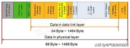 对于RT来说,在物理层上传输的最小报文帧来为88个字节,最大报文帧来为1488个字节。其中包括了12个字节的帧间隔,如下图7所示。