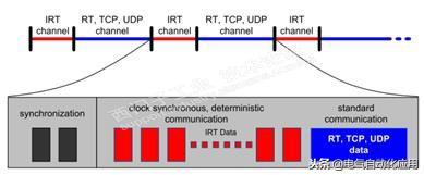 ③ IRT通信是满足最高的实时要求,特别是针对于等时同步的应用。IRT是基于以太网的扩展协议栈,能够同步所有的通信伙伴并使用调度机制。IRT通信需要在IRT应用的网络区域内使用IRT交换机。在IRT域内也可以并行传输TCP/IP协议包,如图4所示。