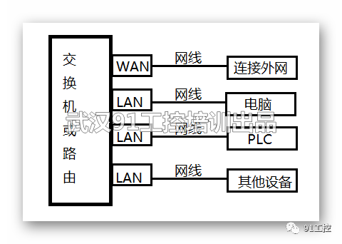按下图用网线把PLC和电脑连接好,如果没有外网,WAN口是不用连接的。电脑网口和PLC网口全部接路由器/交换机的LAN口就行。