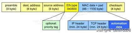 ① 使用了IEEE 802.3以太网标准和TCP/IP,报文结构如图2所示。大多数的PROFINET通信是通过没有被修改的以太网和TCP/IP包来完成。这使得可以无限制地把办公网络的应用集成到PROFINET网络中。