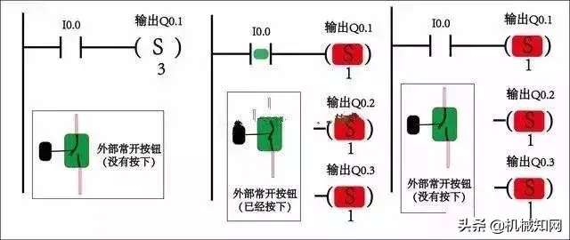 2,外部常开按钮按下时I0.0接通,Q0.1置位线圈就有了输出。