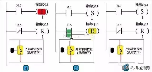 4,外部常闭按钮没有按下时I0.5没有接通,Q0.1复位线圈就没有输出。