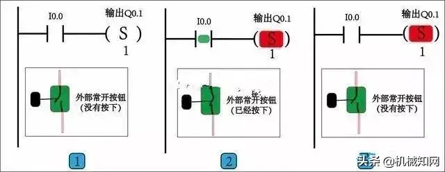 3,松开外部常开按钮时I0.0断开没有接通,虽然I0.0已经断开没有了接通,但Q0.1置位线圈依然还是有输出,实现了自锁功能。直到有复位信号时它才会没有输出,这就是置位操作指令的特点。