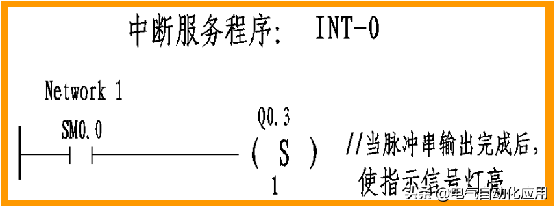 建立中断连接:用ATCH指令建立脉冲输出完成中断事件与中断程序的联系。当PLS指令输出完指定数量的脉冲串时,产生中断。