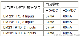 表5. TC(热电偶)和RTD(热电阻)模块所消耗的电流