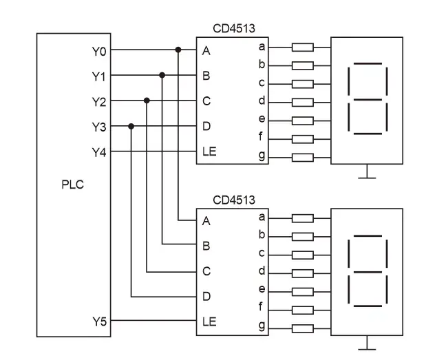 上图两只CD4513的数据输入端A-D共用PLC四个输出端Y0-Y3,A为最底D为最高,LE 为寄存输入端,当LE 为高电平时,输入数据将存在芯片内的寄存器中,并将其译码后显示出来。如PLC使用继电器输出模块时,与CD4513相连的输出各端在接一个下拉电阻,避免输出继电器断开的时候CD4513输入端悬空。