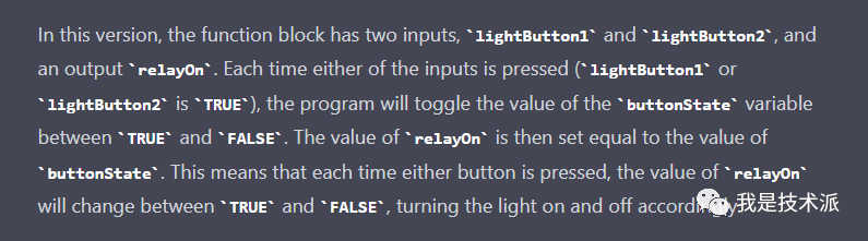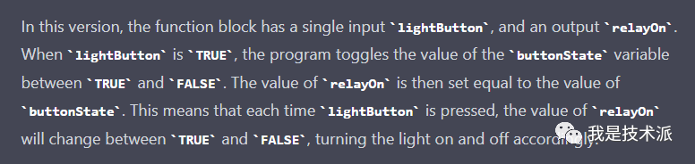 然后将 relayOn 的值设置为等于 buttonState 的值。这意味着每次按下 lightButton 时,