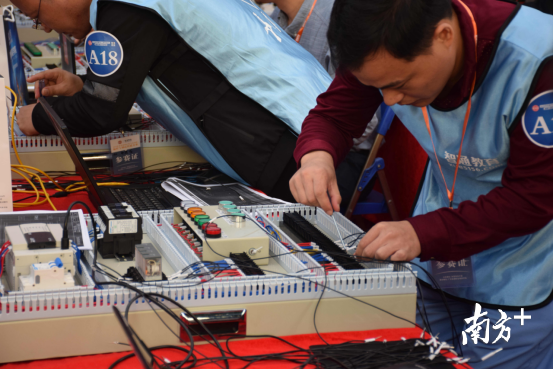 在第二轮比赛中,4名参赛选手在竞赛设备前整装待发,分析图纸、检查设备,计时开始,大家便熟练地操作了起来:有的在进一步调试设备;有的在仪器上开始手工编程……虽然只有4个人比赛,偌大的实训室里却热火朝天,工具声、机器声不绝于耳。
