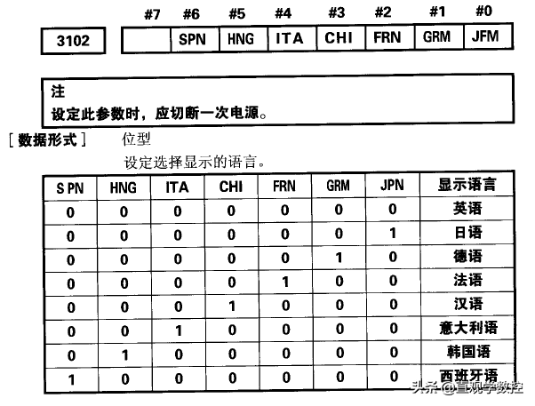 2 FANUC OIA,OIB,OIC ,首先要打开功能参数9924.2=1.(新版本OIC无此参数,不用打开)。然后设置语言参数表如下(3102.3=1):