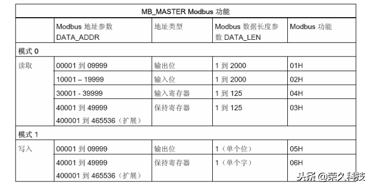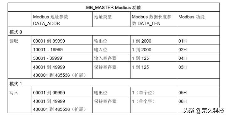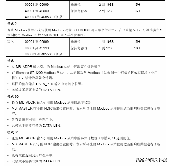 注意: S7-1200的MODBUS RTU通信功能是通过使用“DATA_ADDR”和“MODE”的组合 来选择MODBUS功能码,如下表所示。