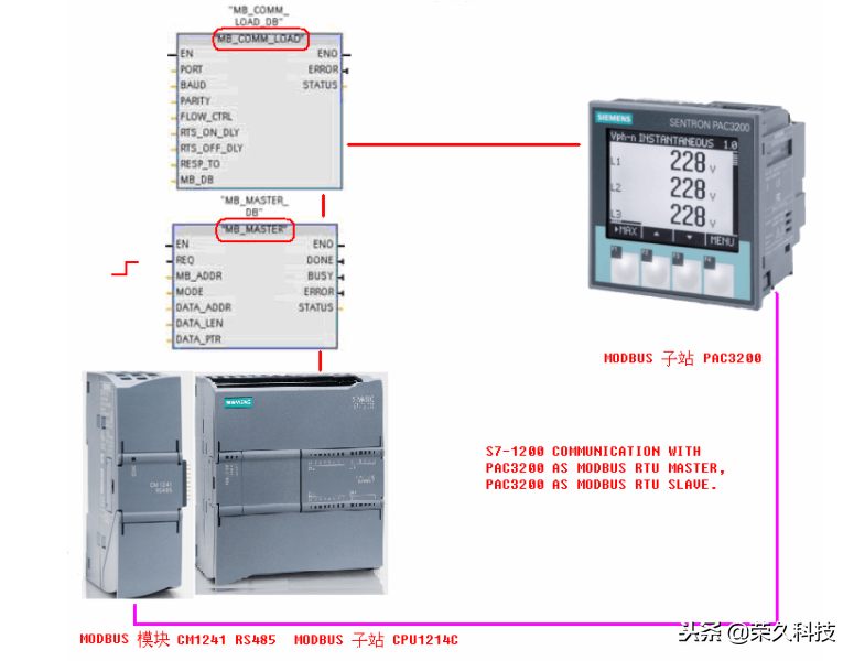 S7-1200 PLC作为MODUBUS 主站 与PAC3200 进行MODBUS RTU 通信的控制原理如下图所示: