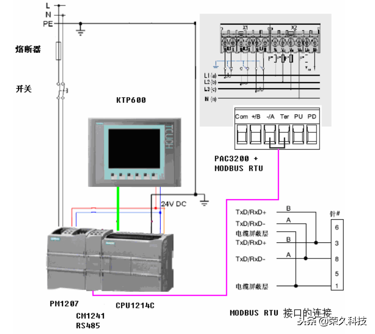 下图是SENTRON PAC3200仪表与S7-1200进行MODBUS RTU 通信的接线图。