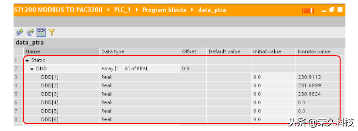 特别注意的是:由于仪表PAC3200的寄存器与S7-1200 MODBUS RTU寄存器的不一致性,读取仪表PAC3200的DATA_ADDR的地址必须从40002开始。