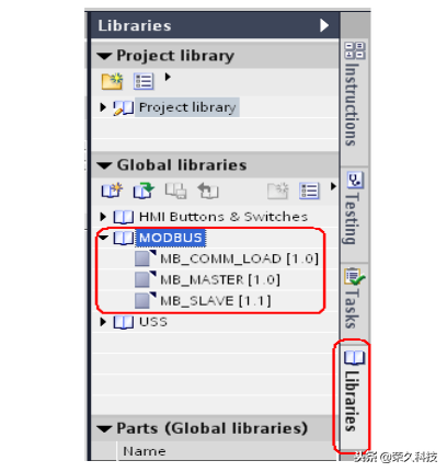 S7 1200提供了专用的MODBUS库进行MODBUS通信,如下图所示: