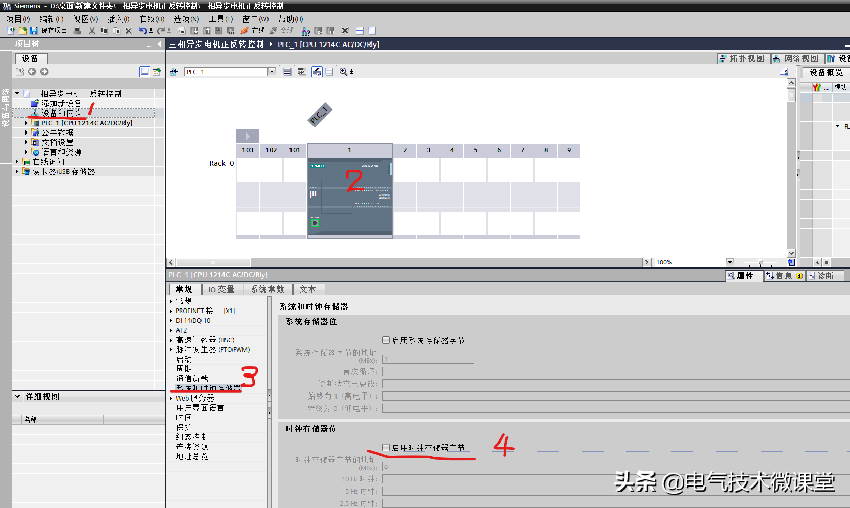 在S7-1200PLC程序中除了使用两个定时器来产生脉冲信号,还可以应用PLC的系统和时钟存储器来产生特定频率的脉冲信号。时钟存储器的设置和使用步骤如下: