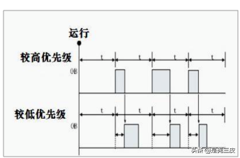 2.下图中,没有设置相移时间,以相同的时间间隔调用两个 OB ,则低优先级的OB 块将不能以固定间隔时间 t 执行;何时执行受高优先级的 OB 执行时间影响,请看下图: