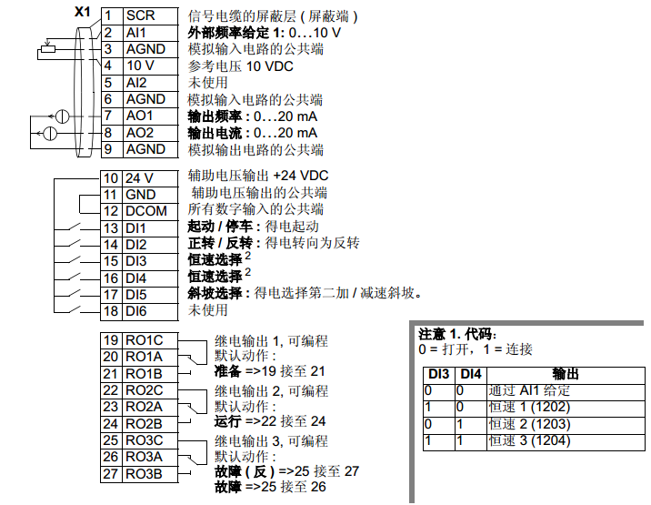 有了上述基本概念之后,我们以最常用的ABB ACS510变频器为例,讲述下该变频器在标准宏模式下的接线以及参数配置的具体过程。