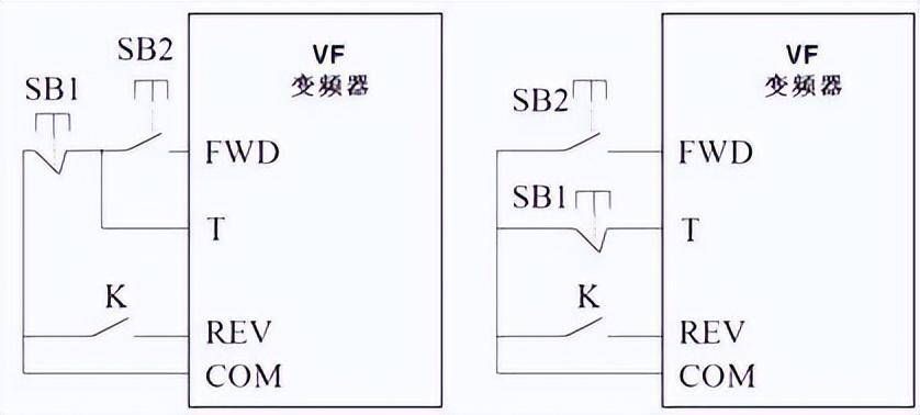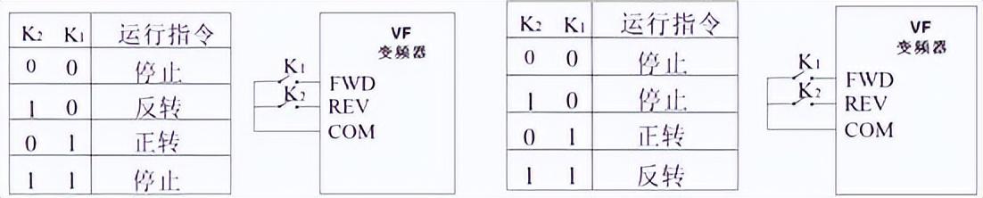 “二线”的原理类似于普通的具有分合两位置的开关,利用分与合两个位置来控制变频器的运行及停止。当开关导通时,变频器运行,断开时变频器停止,如果带反转功能的还需要再接一个输入转向控制端子。FWD代表正转端子,REV代表反转端子,K1、K2代表正反转控制的接点信号。图2a中接通FWD和REV的其中一个就能正反转控制,即FWD接通后正转、REV接通后反转,若两者都接通或都不接通,则表示停机。图2b中接通FWD才能正反转控制,即REV不接通表示正转、REV接通表示反转,若FWD不接通,则表示停机。