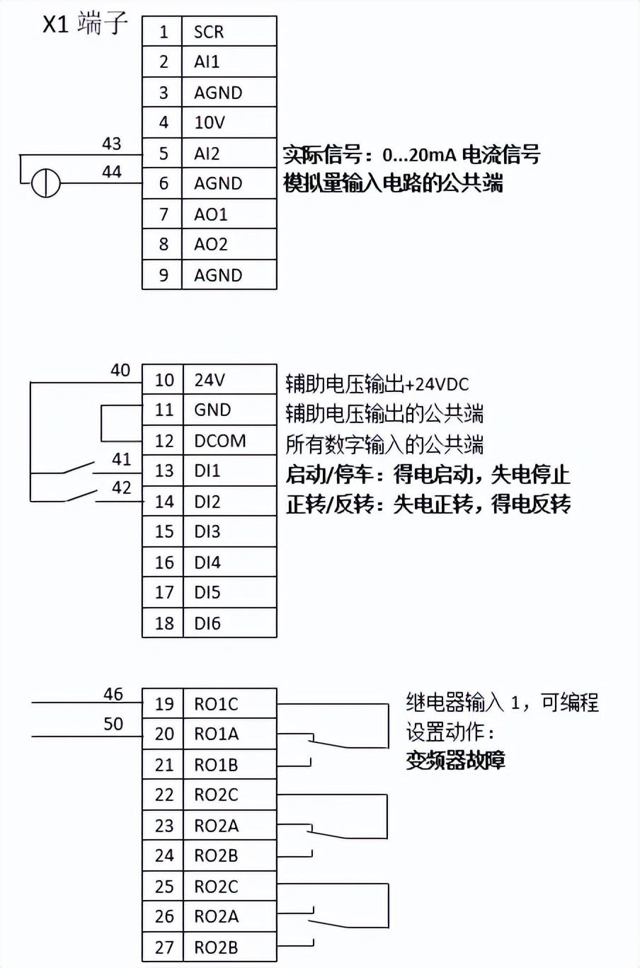 有了变频器的默认接线图和参数配置表之后,下面将分析变频器在该模式下参数配置和接线之间的对应关系。