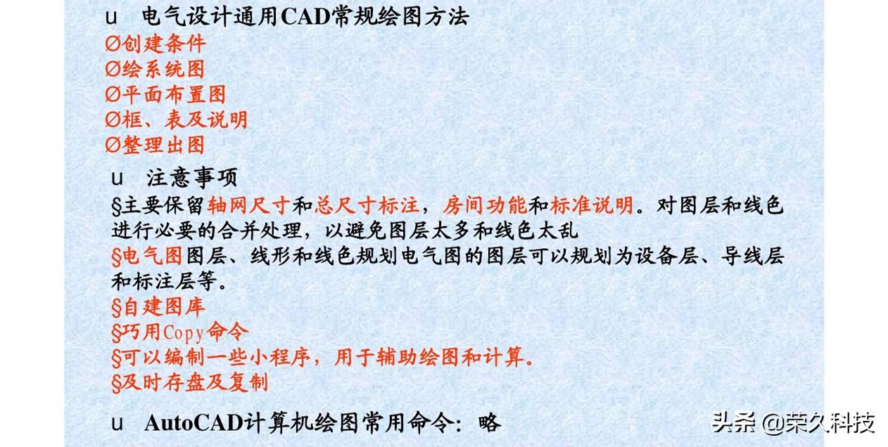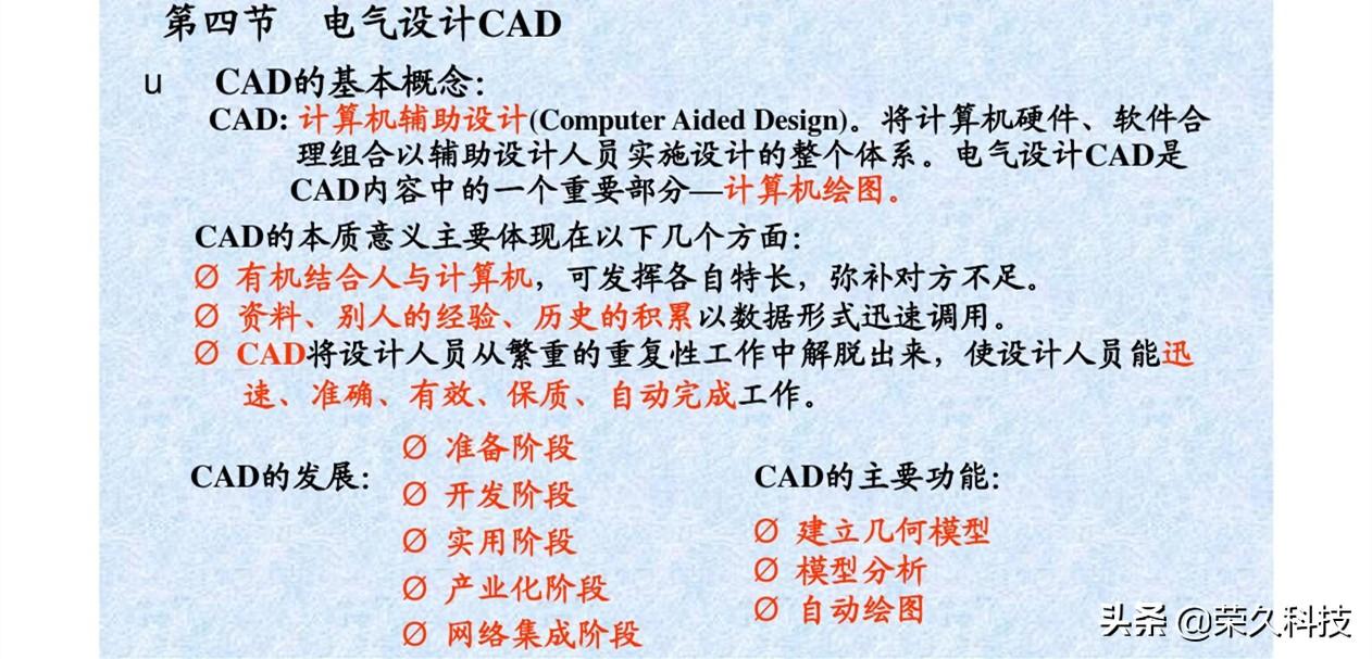 主要介绍了电气控制系统设计的基本内容、原则和方法。电气元器件的选择以及系统的保护环节。通过设计CW163卧式车床来说明电气控制电路的设计过程,来介绍了电气设计的主要内容,计算机辅助设计通用CAD绘图的常用方法及常用指令,电气设计CAD及软件。