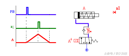 当按一下PB(Pulse),则气压缸慢慢前进A+