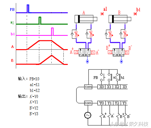 顺序如图,当PB ON时,A气压缸来回运动一次。同时,B气压缸来回运动一次
