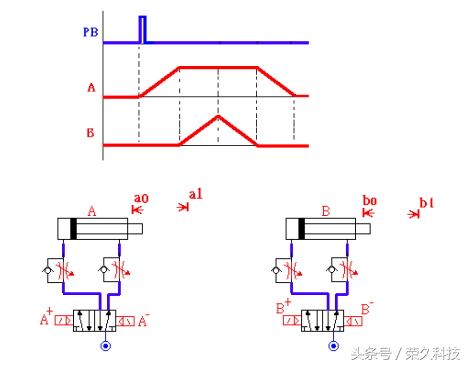 6、A、B皆为单动缸,分别以单边电磁阀控制