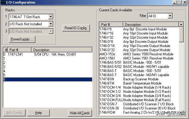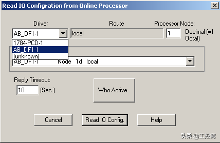 此时,点击Read IO Config按钮,出现一个选择通讯路径的画面,选择实验一创建的DF1驱动,然后按下Read IO Config按钮,将会完成IO的自动配置。