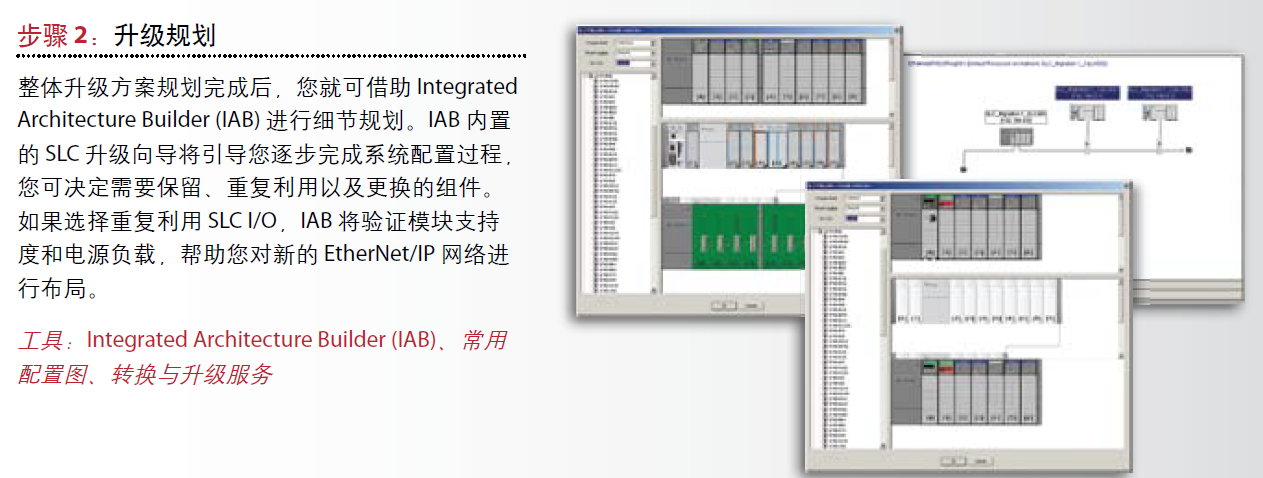 整体升级方案规划完成后,您就可借助 Integrated Architecture Builder (IAB) 进行细节规划。IAB 内置 的 SLC 升级向导将引导您逐步完成系统配置过程,您可决定需要保留、重复利用以及更换的组件。如果选择重复利用 SLC I/O,IAB 将验证模块支持度和电源负载,帮助您对新的 EtherNet/IP 网络进行布局。