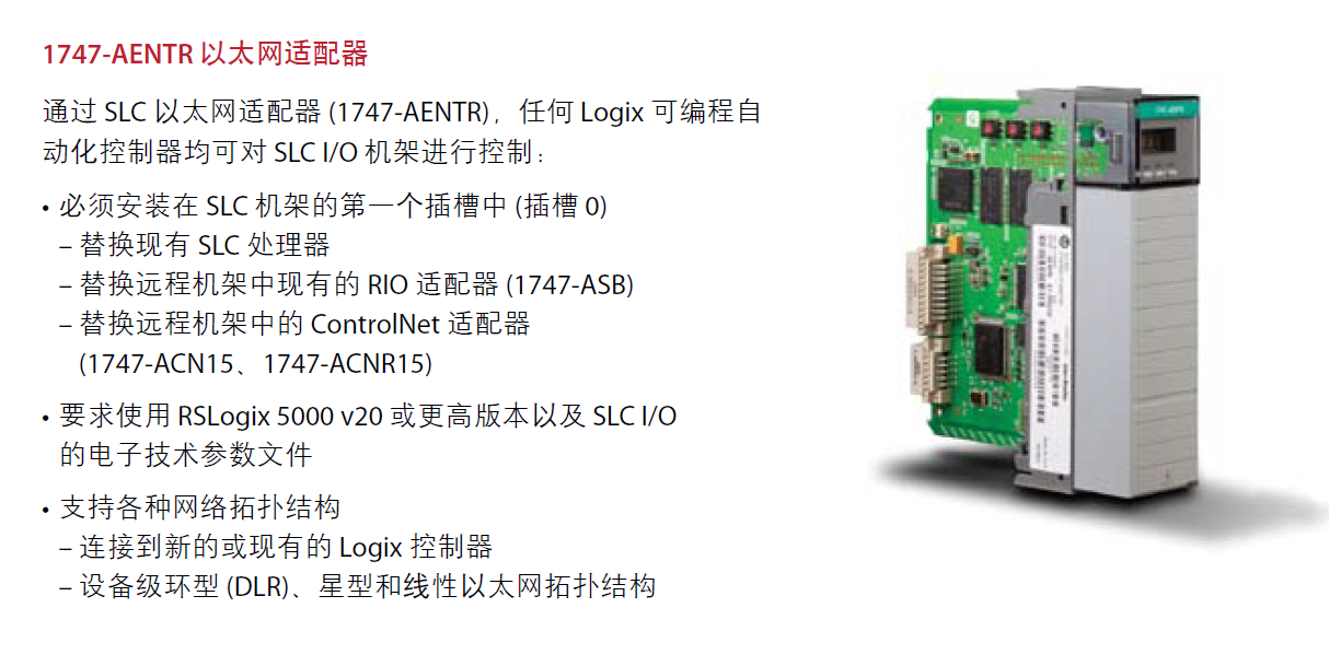 通过 SLC 以太网适配器 (1747-AENTR),任何 Logix 可编程自动化控制器均可对 SLC I/O 机架进行控制: