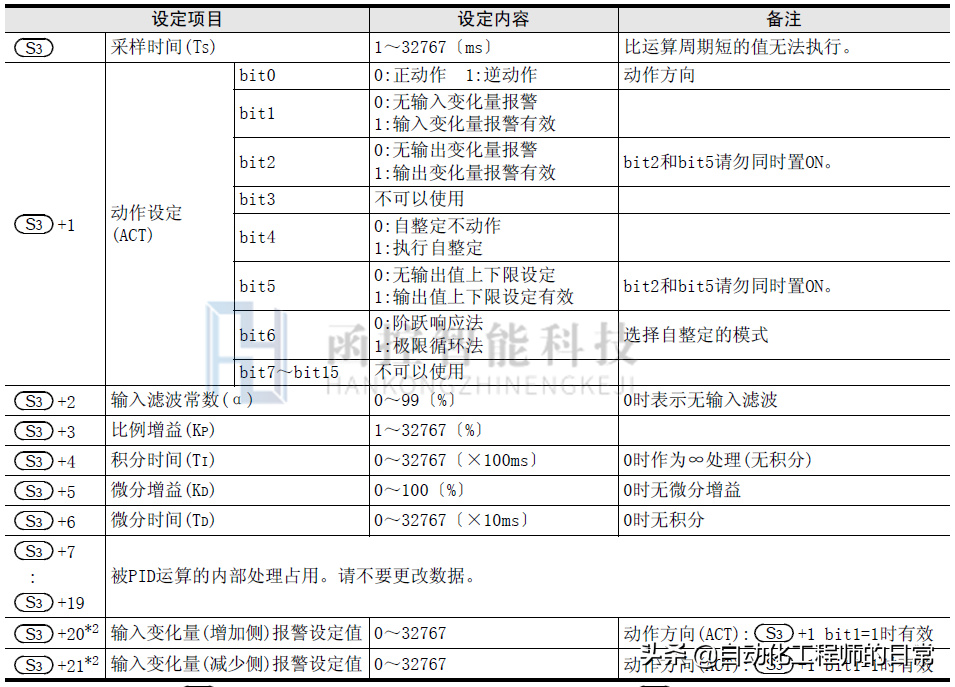 执行对目标值S1、测量值S2、参数S3~S3+6进行设定的程序后,每隔采样时间S3将运算结 果(MV)保存到输出值D中。