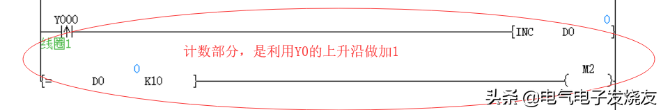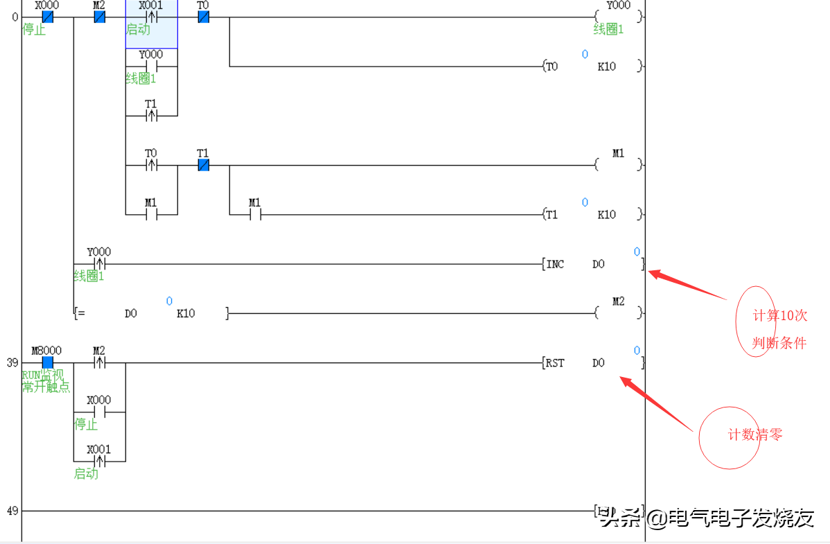 二、控制要求:当按下启动按钮X1,Y0作1秒交替闪烁,然后交替闪烁10次就自动停止,再次按启动又重新计数交替闪烁,X0为停止按钮。现编写程序如下