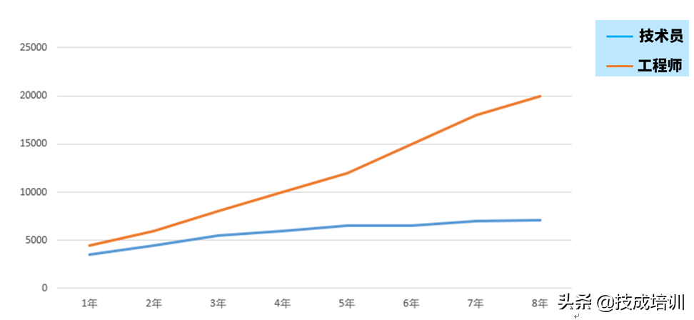 上图是鄙人和很多同行业的工程师的交流分析,最后整理出来的一个工资分布表,当然这张表只针对普通的情况,对于那些年入百万的人可忽略不计,大家可以看到上图,红色线是会PLC编程的工程师的工资发展,而蓝色线是不会PLC的普通电气技术员,两者工资的起点差不了多少,技术员的工资提升缓慢,差不多7 8千就是一个瓶颈,而会PLC编程的工程师工资增长非常快,5年的工作经验,只要不是特别水都能拿到1万5左右的工资。当然,这个也是一个瓶颈,很难在突破上去,除非,你非常厉害。