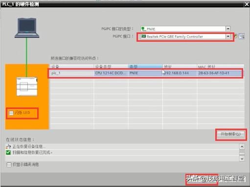 接着会进入软件与CPU的设置界面,我们设置好PG/PC接口,设置好后点击“开始搜索”,系统就会自动搜索CPU。选择搜索出来的CPU,点击“检测”按钮就可以获取到实际的硬件信息了。