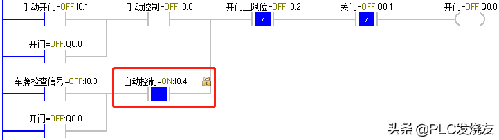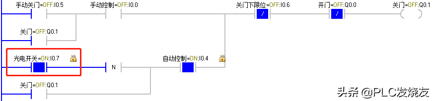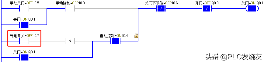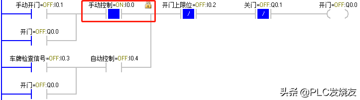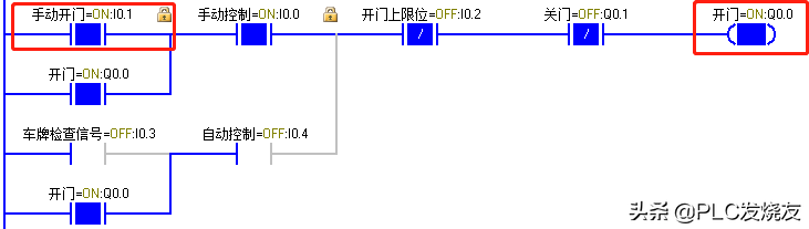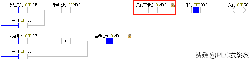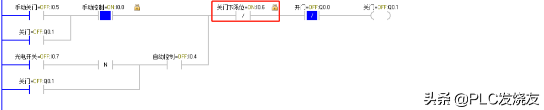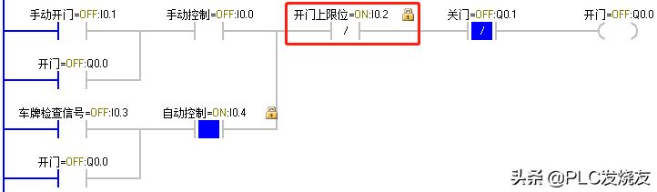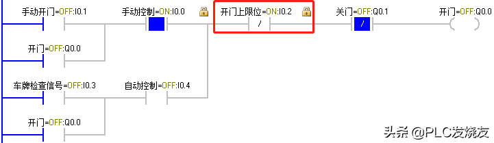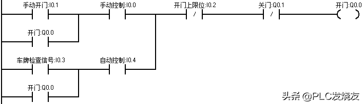 (2)当货车到达大门前时,由车牌识别器识别到正确车辆后反馈给PLC一个逻辑1信号,I0.3动作,Q0.0 得电自锁,卷帘门上升,上升至上限位碰到上限位开关 I0.2,Q0.0失电,卷帘门停止。