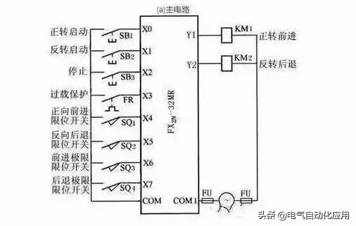PLC的输入信号:正转启动按钮SB1,反转启动按钮SB2,停止按钮SB3,热继电器常开触点FR、正向前进限位开关SQ1、反向后退限位开关SQ2、前进极限限位开关SQ3、后退极限限位开关SQ4。