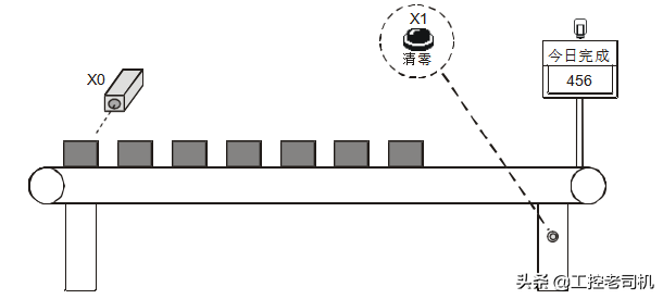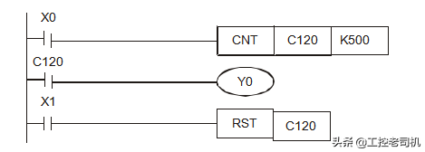 每完成一台产品,C120 计数一次,计数到 500 次,Y0=On,目标完成指示灯亮。