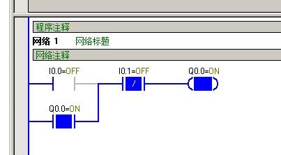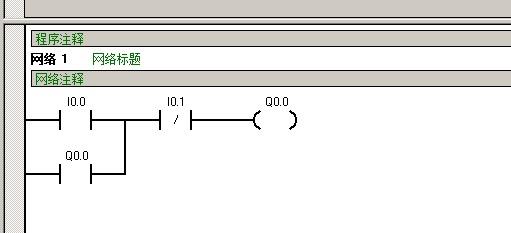 到此为止,所有的设置工作都已经顺利完成,我们可以进行愉快的Step7的梯形图编程,我们这里简单做一个起保停程序,所谓的起保停,指的是,按下启动按钮,开始启动,松开按钮,可以继续运行,按下停止按钮,程序结束运行。最简单的实例就是开灯关灯程序,按下绿色按钮,灯亮,按下红色按钮,灯灭。程序很简单,如图所示:
