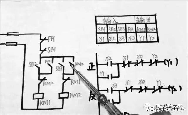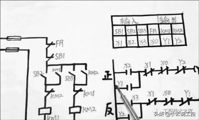 首先可以看到SB2,x2之后是自锁键,并接到一对常开点,万一交流接触器的常开点并肩之后是x1停止按钮之后是热计电器,x0之后是交流接触器的,常闭点作为互锁键,可以看到Y2,没有斜杠指的是常开点,有斜杠指的是常闭点使用的时候一定要区分清楚正传的输出万一KM1交流接触器,这个是正转的控制回路,来看一下反转的控制回路,他们两个是一样的,之后是自锁点,Y2-KM2的自锁点,都是常开点,之后是SB1停止按钮,常闭点,逻辑的闭点,x0之后是Y1的搜索点有斜杠,指的是逻辑上的闭点,没斜杠指的是逻辑上的开点,最后是输出Y2。