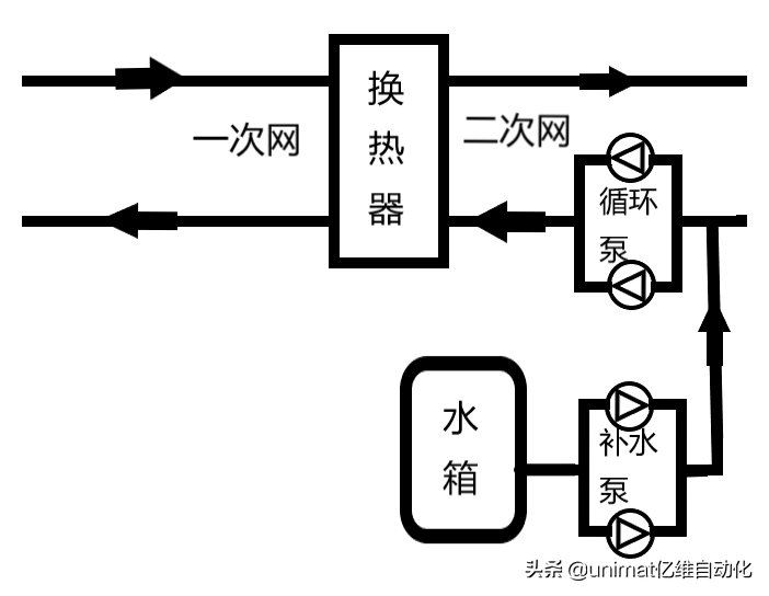 供暖流程。在一次网热介质由热电厂流出,经换热器后从二次网回路重新回到热电厂。在循环泵的作用下,在二次网经过换热器加温过的介质(一般为水),流到用户,由住户安装的散热器后经过回水管流回换热站。由于在二次网中会由于用户放气或者管道漏水等原因,水量一直减少。补水泵从水箱抽取水来时刻给二次网进行补水。整个流程如下图。