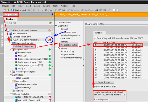 在线 S7-1200 PLC。PLC 的弯曲信号表示诊断错误。(图. 07,蓝色环)。浏览“项目树”的“在线和诊断”。浏览“在线访问”窗口的导航区域,进入“诊断缓冲区”。在“事件”表里选择断线事件。在“事件”表下,将显示选定事件的详细内容。您可以找到 HW-ID,通道号,事件类型。