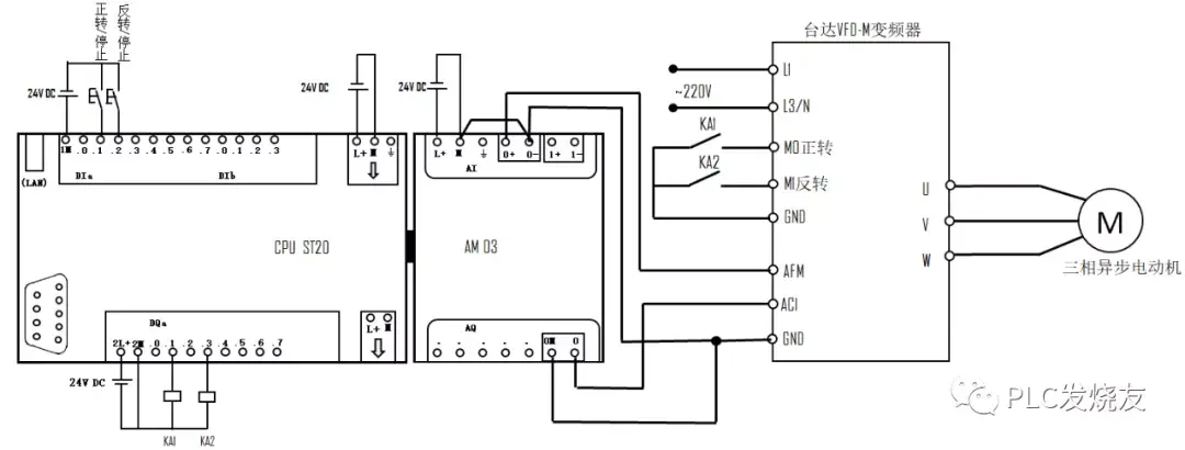 下图是PLC和模拟量模块及变频器的接线