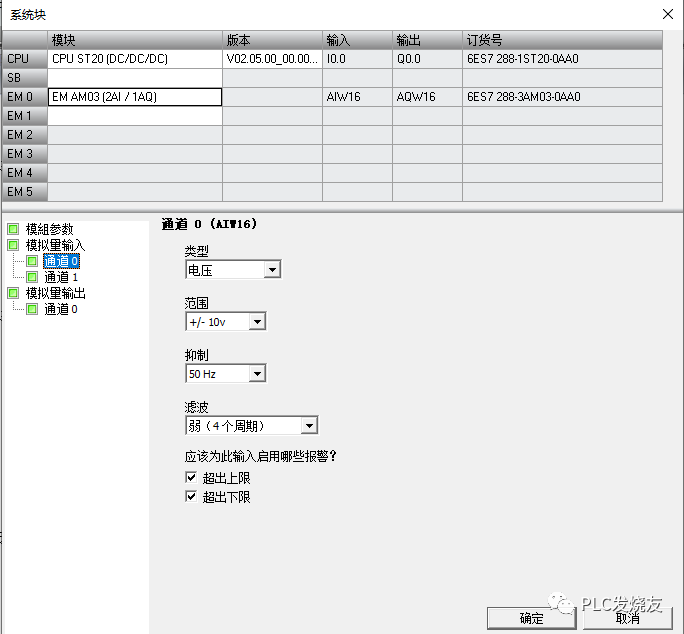 (4)在模拟量模块组态时输入信号为两路为同一组信号类型