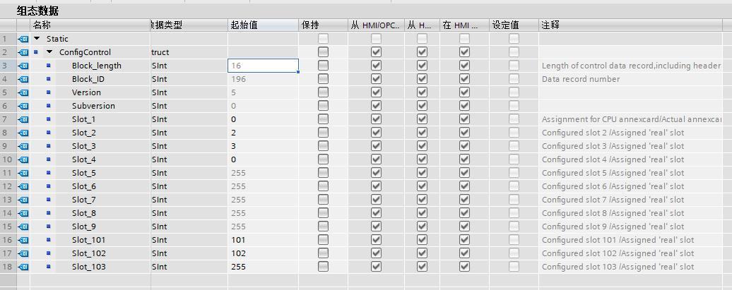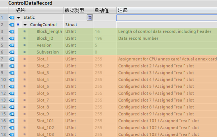 创建一个用于包含控制数据记录的PLC数据类型,其中前4个USInt变量用于存储组态控制信息,后面12个USInt变量对应于S7-1200最大组态时的各个插槽的实际状态。用颜色分割开来。