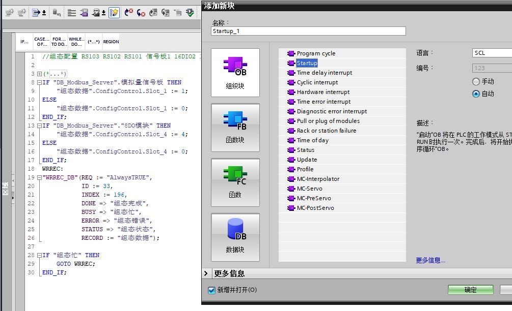 判断是否使用信号板?如果有就把实际插槽位置写入这里为1,否则就是不用写为0判断第4个的8DO模块是否使用,如果使用就把实在插槽位置写入这里为4,否则就不用写0下面调用的是西门子WRREC写入数据指令吸入配置数据。如果没有写入完成,跳转到标签继续执行指令(当然用梯形图JMP跳转指令也可以)这里要注意 上电第一个扫描周期执行。9.其实这样已经成功了