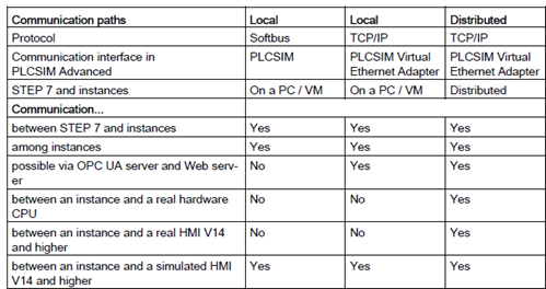 S7-PLCSIM Advanced仿真:与S7-PLCSIM 相比,S7-PLCSIM Advanced增强了通讯仿真能力,可通过虚拟网卡仿真OPC UA服务器,也可以与实体PLC或HMI通信,相当于软PLC,下表是S7-PLCSIM Advanced 通过不同的仿真方式能达到的通信能力,参照仿真软件的功能手册Function Manual)。当然有S7-1500 PLC实物的话可以不需要仿真。