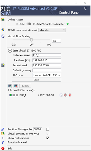 选择仿真方式和填写Instance name之后就可以激活仿真,本案例使用的是S7-PLCSIM Advance V2.0 SP1如下图:
