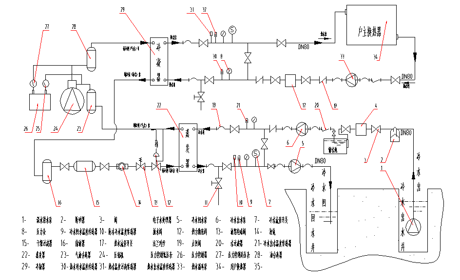 热泵侧循环水,由用户末端设备回来的35℃~40℃的水,经过水源热泵机组再制备成50℃的热水送到用户末端设备进行制热采暖。取热后的地下水通过回灌井返回到地下。为节省篇幅,请见图1所示,“水源热泵热水机组制热实际系统图”。