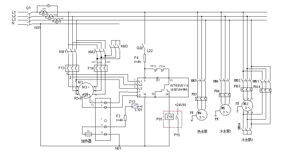 本水源热泵自控系统包括主电路设计、控制电路设计。主电路设计包括热水泵主电路,冷水泵1/2主电路,压缩机主电路。主电路需完成的功能由热水泵启动及运转;冷水泵1和2启动及运转;压缩机启动及运转。