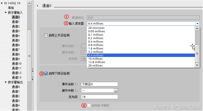 “事件名称”:定义该事件名称 “硬件中断”:当该事件到来时,系统会自动调用所组态的硬件中断组织块一次。如果没有已定义好的硬件中断组织块,可以点击后面的省略按钮并新增硬件中断组织块连接该事件。④“启用脉冲捕捉”:根据 CPU 的不同,可激活各个输入的脉冲捕捉。激活脉冲捕捉后,即使脉冲沿比程序扫描循环时间短,也能将其检测出来。
